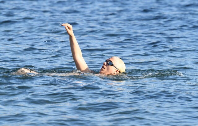 Deniz gözlüğüyle suya giren Erdem, kısa bir süre yüzdü.