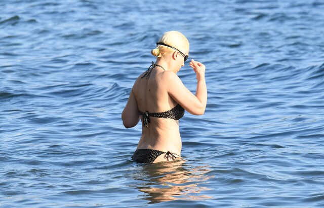 Gümüşlük'teki bir plajda objektiflere yansıyan oyuncu, akşam üstü denize girdi.