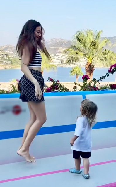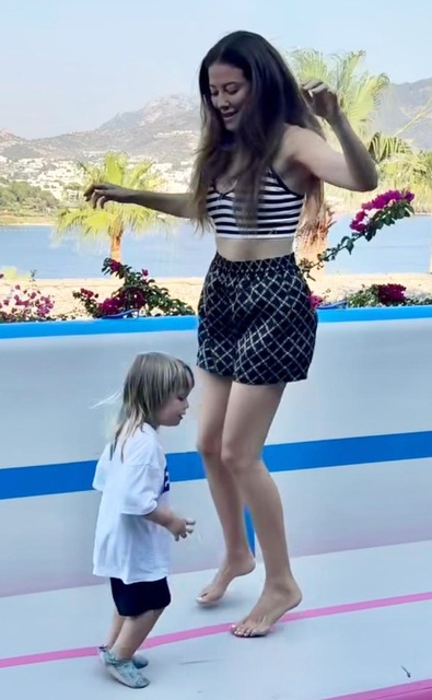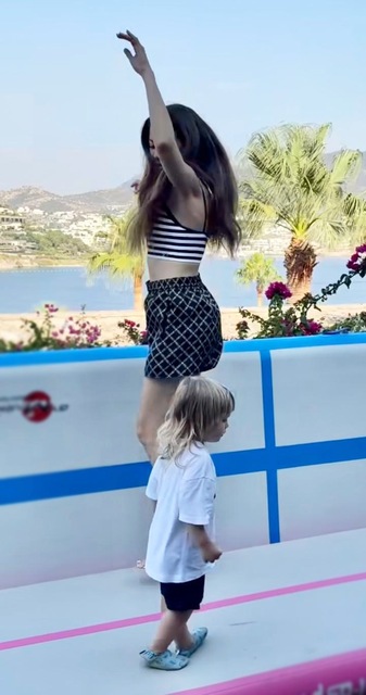 Yayımlanan videoda Başak Dizer Tatlıtuğ ile oğlu Kurt Efe Tatlıtuğ'un, zıplayarak oyun oynadığı görülüyor.