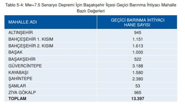 Deprem sonrası insanların, hasarlı olmasa da binalara girmeyip bir süre dışarda olmayı tercih etmeleri de genel resmi ağırlaştıran bir durumdur. Başakşehir’de Mw=7.5 senaryo depremisonrasında yaklaşık 13.397 hanelik acil barınma ihtiyacının ortaya çıkacağı tahmin edilebilir.Hane başına 3 kişilik nüfus kabulüyle, yaklaşık 40.191 kişinin acil barınma ihtiyacı olacağıbeklenmektedir. Bu tahminlerde de depremin oluş şekline göre, hasarlarda gördüğümüzebenzer belirsizlikler bulunmakta olup, deprem sonrası gerçekleşen acil barınma ihtiyacı içindeki nüfus verilen değerin altında ya da üstünde gerçekleşebilir.