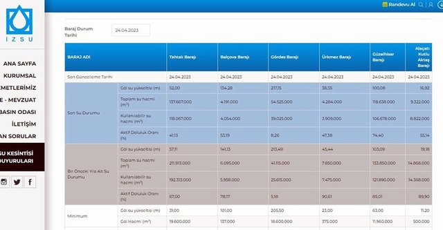 DHA'nın haberine göre İzmir'in su ihtiyacı Tahtalı, Balçova, Ürkmez, Güzelhisar, Gördes ve Alaçatı Kutlu Aktaş barajlarından ve yer altı kaynaklarından karşılanıyor.