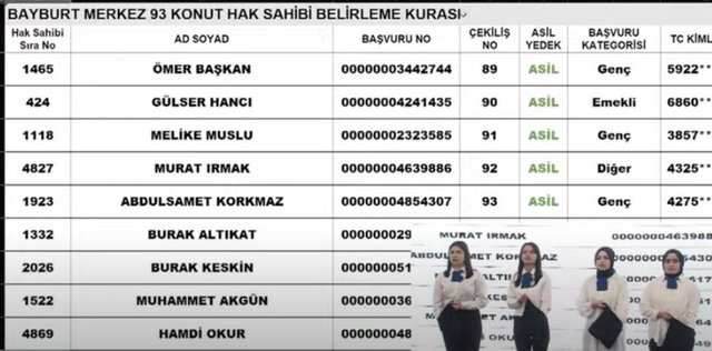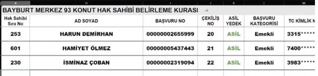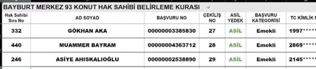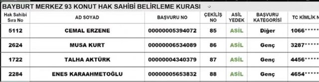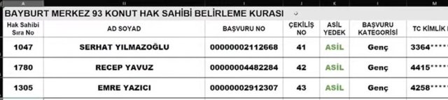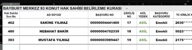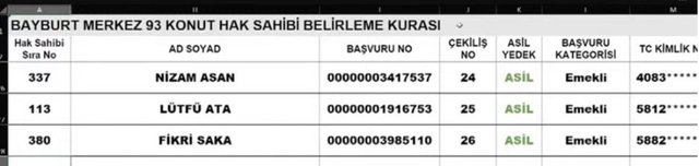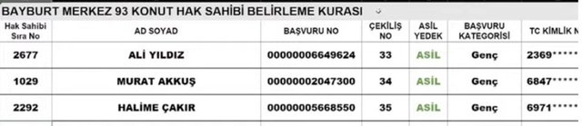 TOKİ Bayburt 19 Aralık kura çekilişinde çıkan bazı hak sahipleri şu şekilde;