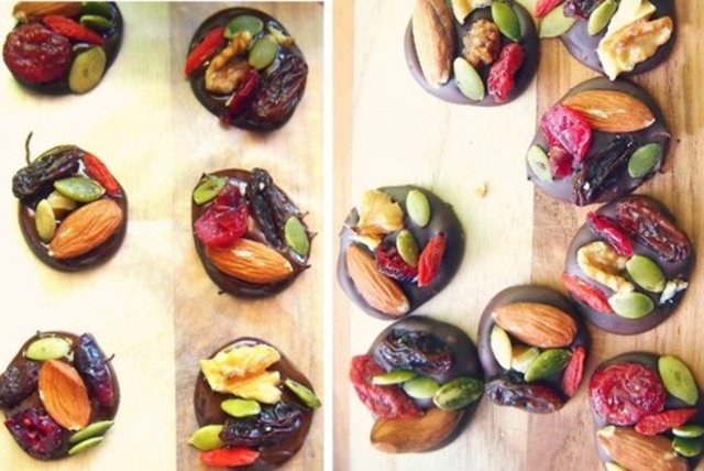 Yapılışı: Mikrodalga fırında ya da benmari usulü bitter çikolataları yakmadan eritin. Yağlı bir kağıt üzerine bir yemek kaşığı yardımı ile erimiş çikolatadan yaklaşık 8 adet daire yapın. Kuruyemişleri istediğiniz gibi çikolataların üzerine dizip hafifçe bastın. 40-60 dk soğuması için bırakın. Daha hızlı sonuç için buzdolabına da konabilir.