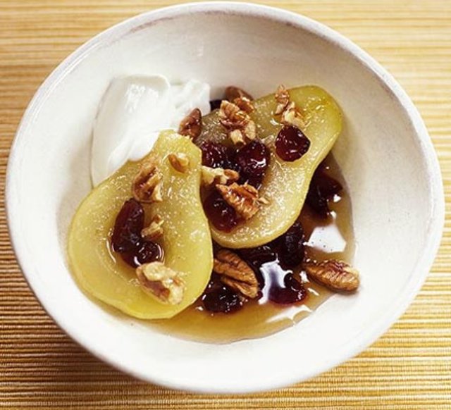 Malzemeler: 4 adet olgun armut, 1 avuç dolusu kızılcık, 2 yemek kaşığı akçaağaç şurubu, 50 g pekan cevizi, elle parçalanmış, servis için süzme yoğurt