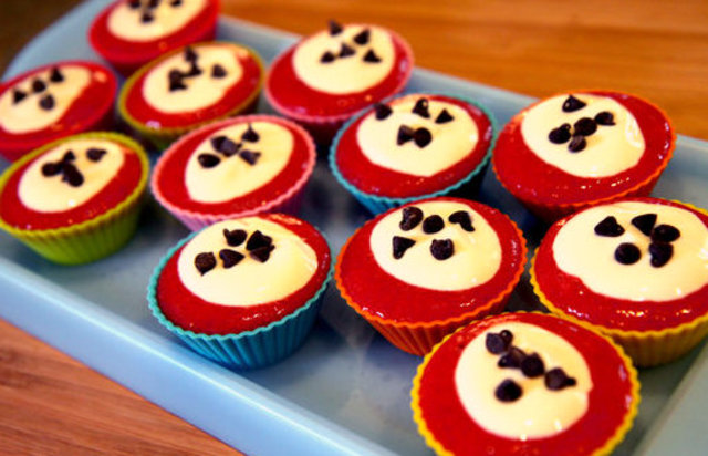 Yapılışı: 12 adet küçük silikon pişirme kaplarını bir dondurma tepsisi ya da küçük ahşap kesme tahtası üzerine dizin. Kapların yarısını yoğurt ile doldurun. Muz ve çileği püre haline getirip küçük bir kaşık yardımıyla önceden konan yoğurt gözükmeyecek şekilde ekleyin. Üzerine kalan vanilyalı yoğurttan biraz daha ekleyip, damla çikolataları serpiştirin. 1 saat dondurucuda bekletin. Yemeden önce 10 dk kadar çözdürün.