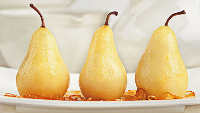 Yapılışı: Küçük bir kasede meyve suları, Hindistan cevizi ve tarçını iyice karıştırın. Armutları soyun ve saplarını bırakın. Armudun alttan çekirdeğini çıkartıp sığ bir tavaya yerleştirin. Sulu karışımı da ekledikten sonra orta ateşte pişirin. Armutları sık sık döndürerek 30 dk kadar pişirin. Piştikten sonra armudu bir tabağa çıkartıp ahududu ve portakal kabuğu ile süsleyin.