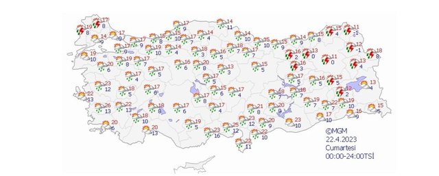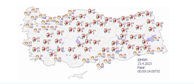 23 Nisan Pazar bayramın 3. günü Gökgürültülü Sağanak Yağışlı 6°C 15°C