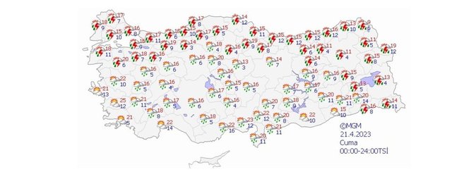 Güneydoğu: 20 Nisan Perşembe bölge genelinde Şanlıurfa çevresi hariç bahar sağanaklarıyla geçebilir. Gök gürültülü yağış 21 Nisan Cuma günü de Doğu Akdeniz yönünde daha kuvvetli olmak üzere aralıklarla sürecek görünüyor. 22 Nisan Cumartesi Osmaniye-Elazığ-Elbistan bölgede en çok yağmur düşebilecek alan, diğer merkezlerde hava açmaya başlarken sıcaklıklar kış mevsimini aratmayacak. Deprem bölgesinde özellikle 22-23 Nisan geceleri soğuk ve ıslak geçecek bu duruma hazırlıklı olunmalı.