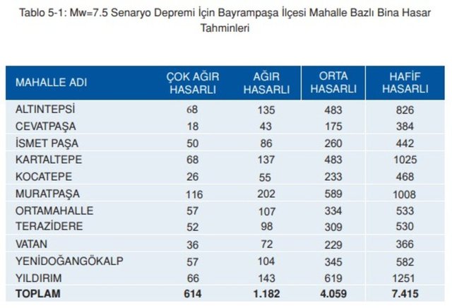 Bilgiler İBB'nin Deprem Risk Yönetimi ve Kentsel İyileştirme Daire Başkanlığı Deprem ve Zemin İnceleme Müdürlüğü ile Kandilli Rasathanesi ve Deprem Araştırma Enstitüsü kaynaklı olup, İstanbul Bayrampaşa İlçesi Olası Deprem Kayıp Tahminleri Kitapçığı'ndan alınmıştır.