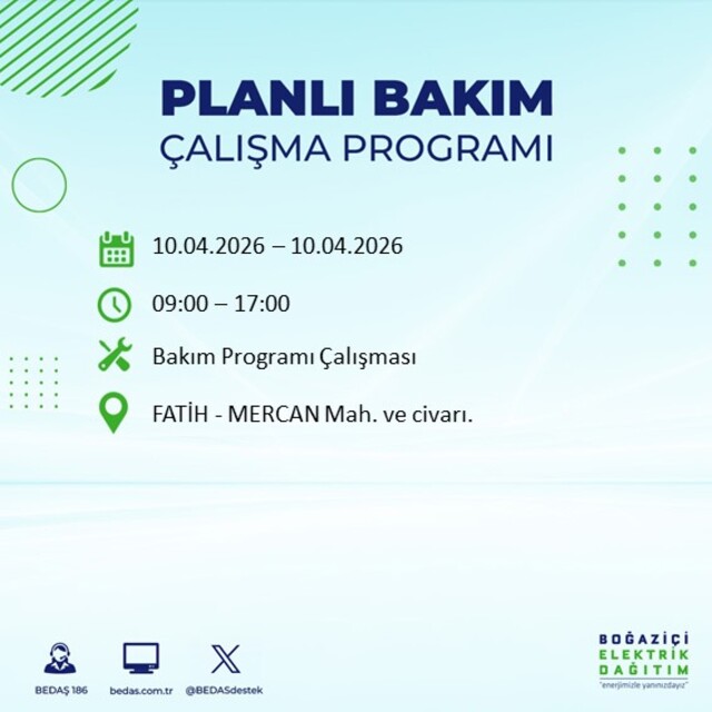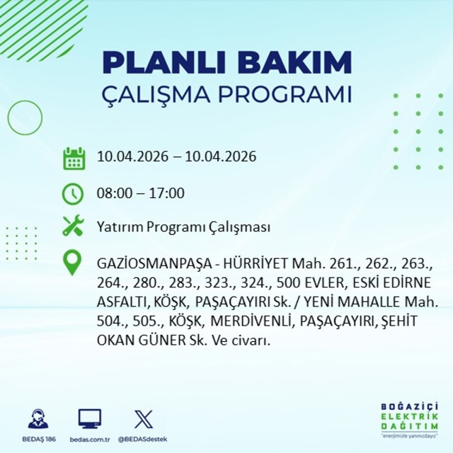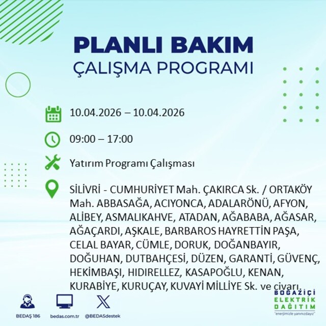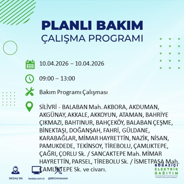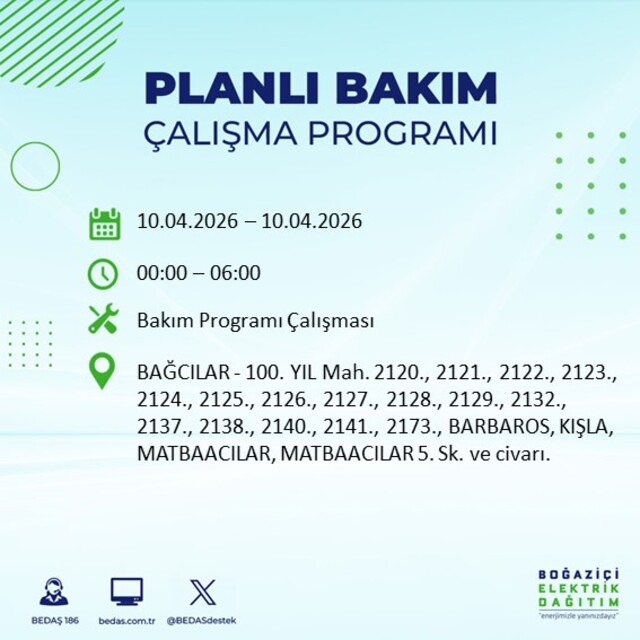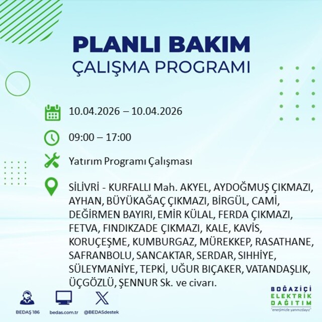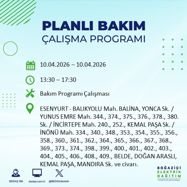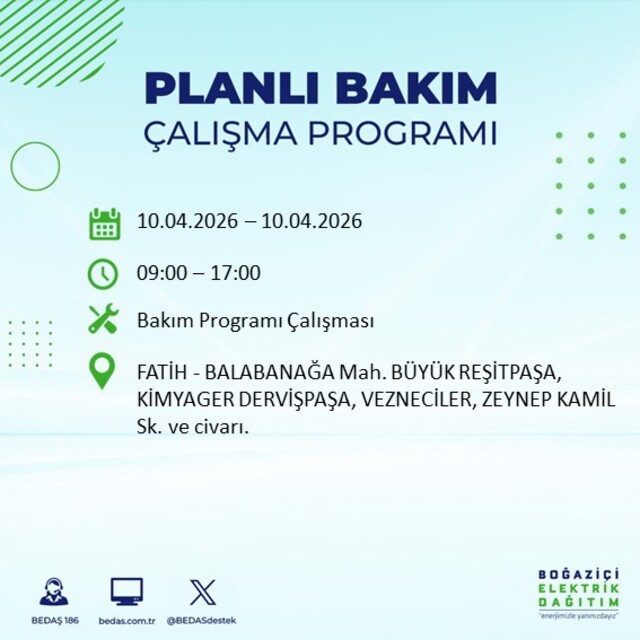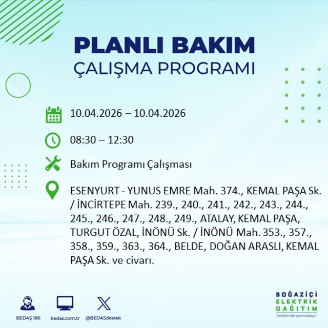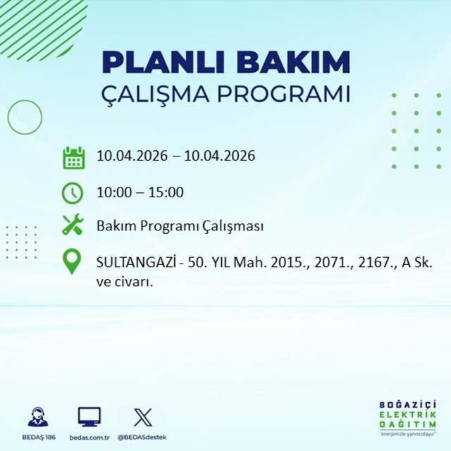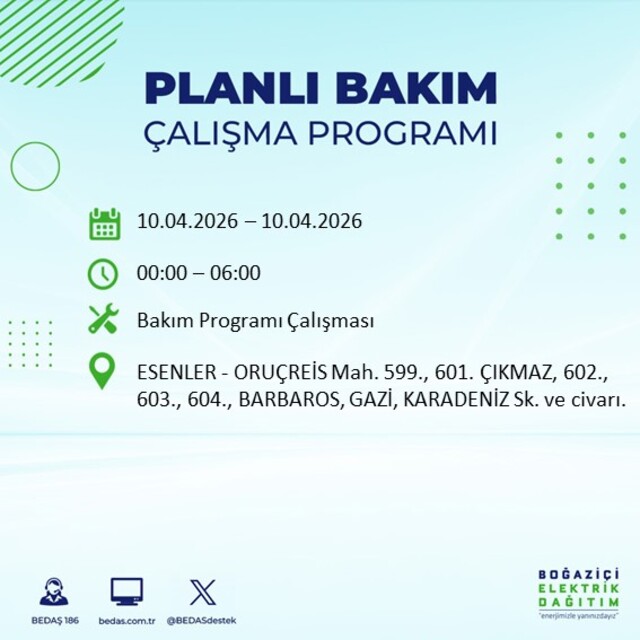 Boğaziçi Elektrik Dağıtım A.Ş tarafından yapılan duyuruya göre 10 Nisan 2026 Cuma günü İstanbul'da farklı saat aralıklarında elektrik kesintileri uygulanacak.