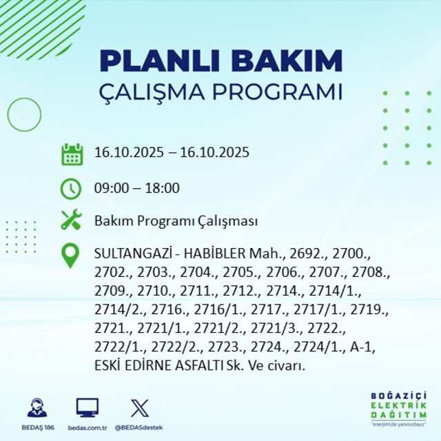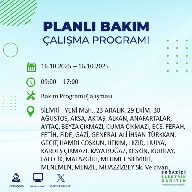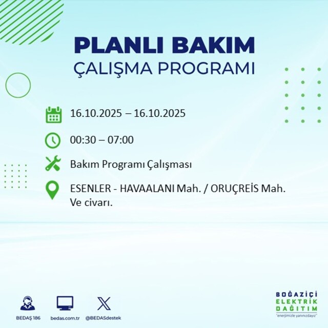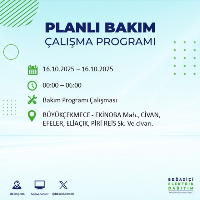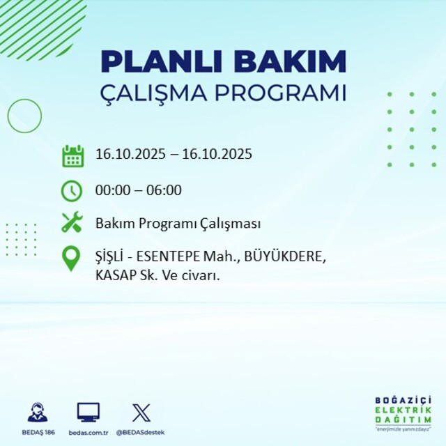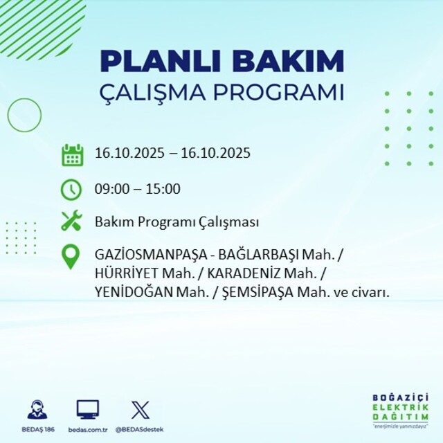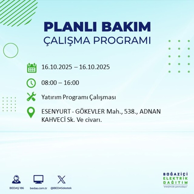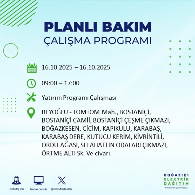 Boğaziçi Elektrik Dağıtım A.Ş tarafından yapılan duyuruya göre 16 Ekim Perşembe İstanbul'da farklı saat aralıklarında 25 ilçede elektrik kesintisi uygulanacak.
