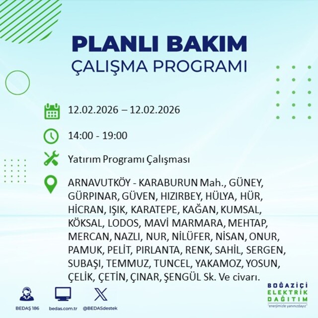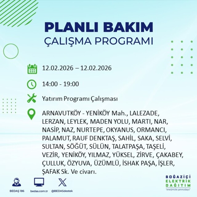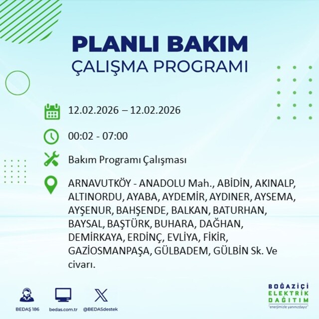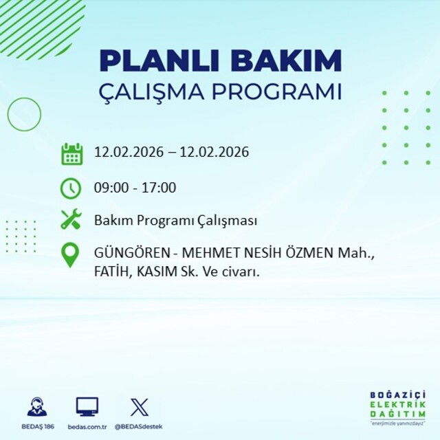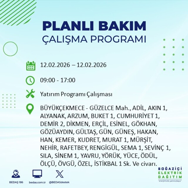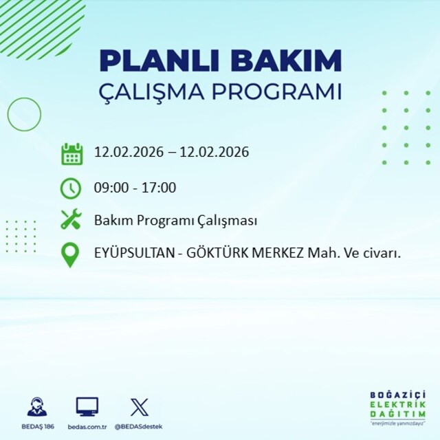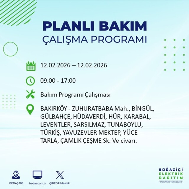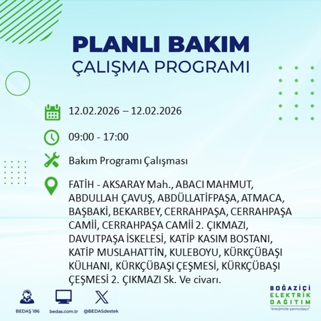 Boğaziçi Elektrik Dağıtım A.Ş tarafından yapılan duyuruya göre 12 Şubat 2026 Perşembe günü İstanbul'da 20 ilçede farklı saat aralıklarında elektrik kesintileri uygulanacak.