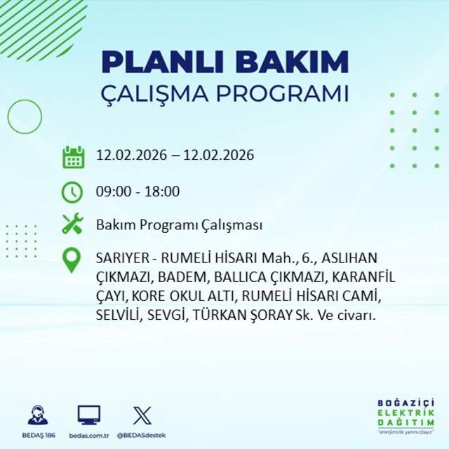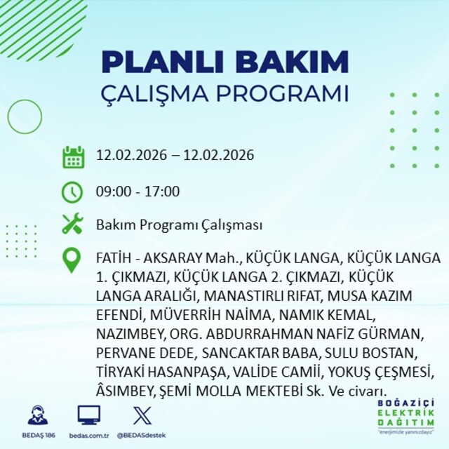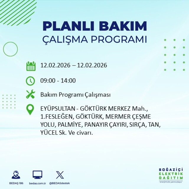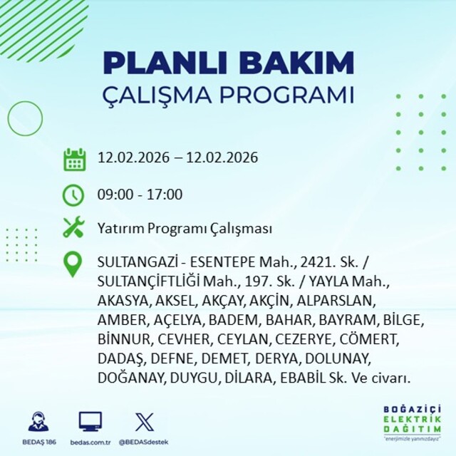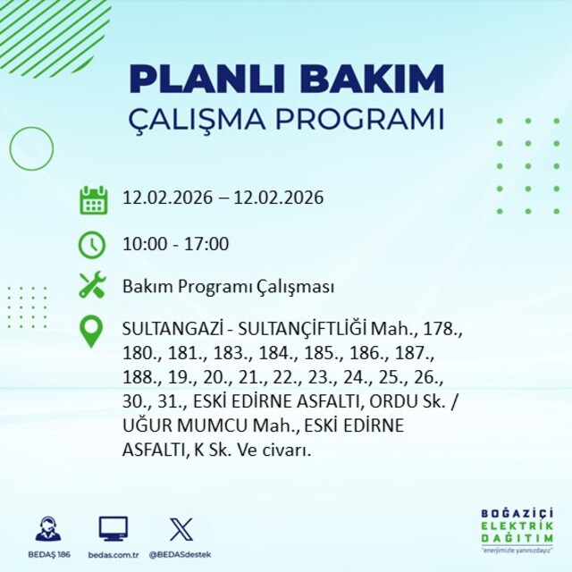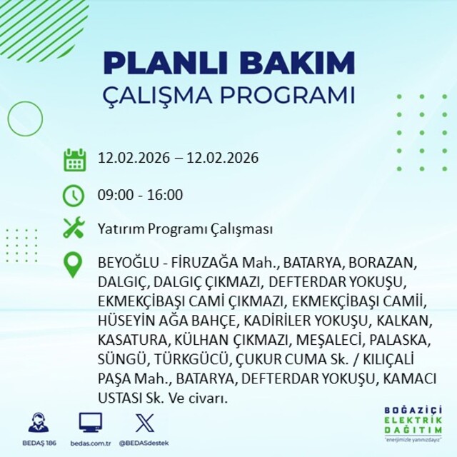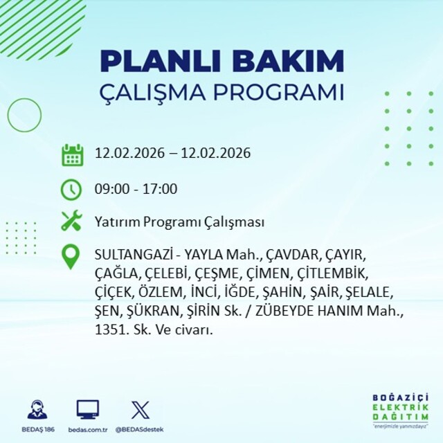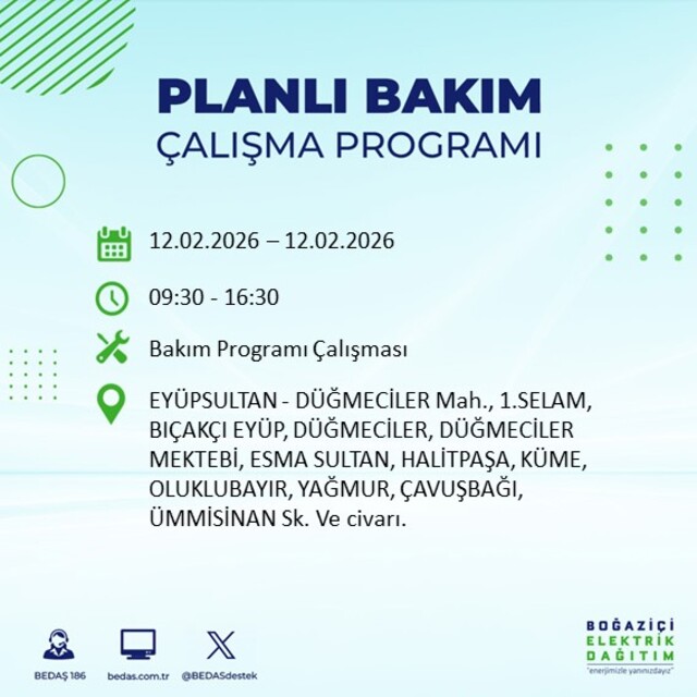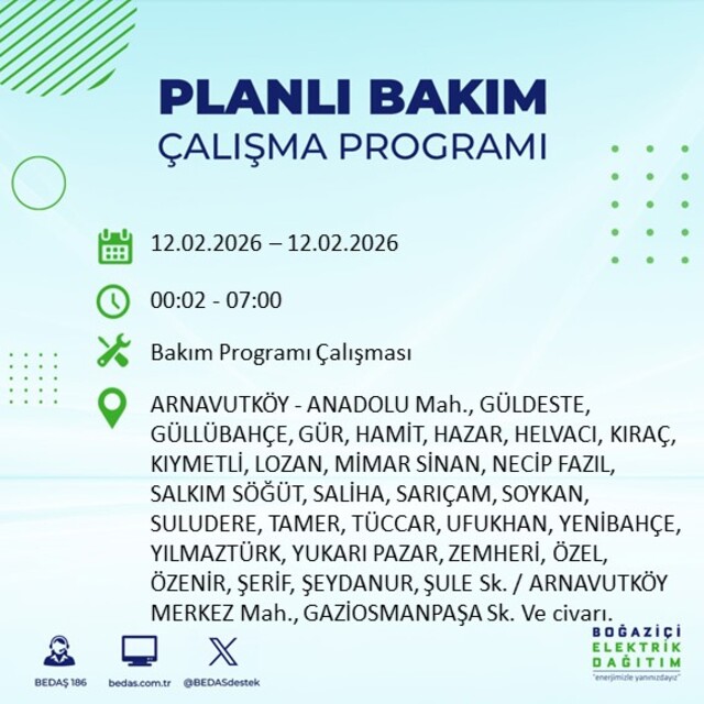 Boğaziçi Elektrik Dağıtım A.Ş tarafından yapılan duyuruya göre 12 Şubat 2026 Perşembe günü İstanbul'da 20 ilçede farklı saat aralıklarında elektrik kesintileri uygulanacak.