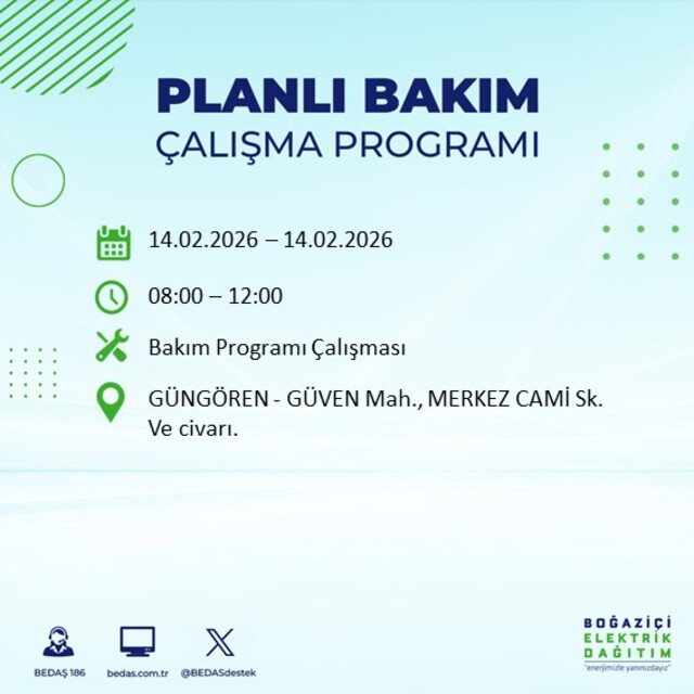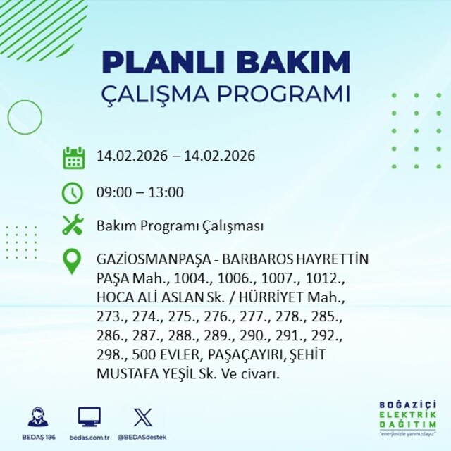 İstanbul genelinde yaşanacak bakım, onarım çalışmaları ve planlı elektrik kesintisi yapılacak ilçeler listesi her gün AYEDAŞ ve BEDAŞ tarafından duyurulmaya devam ediyor. 14 Şubat Cumartesi günü kent genelinde farklı saat aralıklarında 13 ilçede elektrik kesintisi yapılacak. İşte 14 Şubat 2026 Cumartesi İstanbul planlı elektrik kesinti programı...
