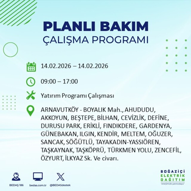 Boğaziçi Elektrik Dağıtım A.Ş tarafından yapılan duyuruya göre 14 Şubat Cumartesi günü İstanbul'da farklı saat aralıklarında 13 ilçede elektrik kesintileri uygulanacak.