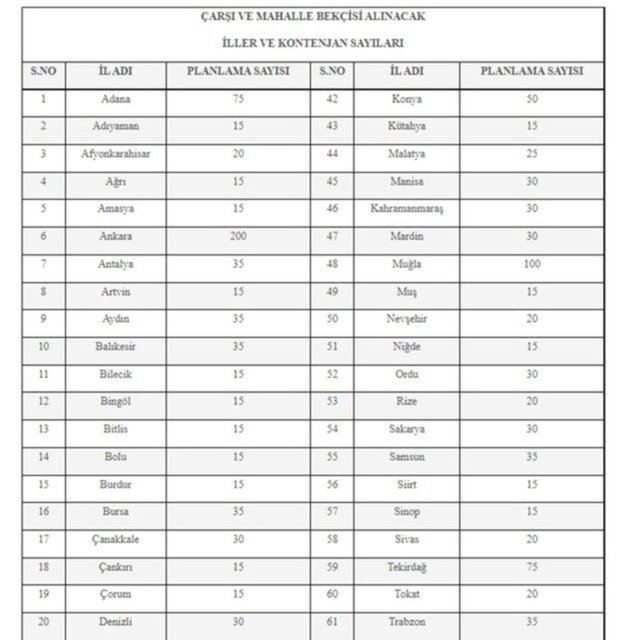 ÇARŞI VE MAHALLE BEKÇİSİ ALINACAK İLLER VE KONTENJAN DAĞILIMI