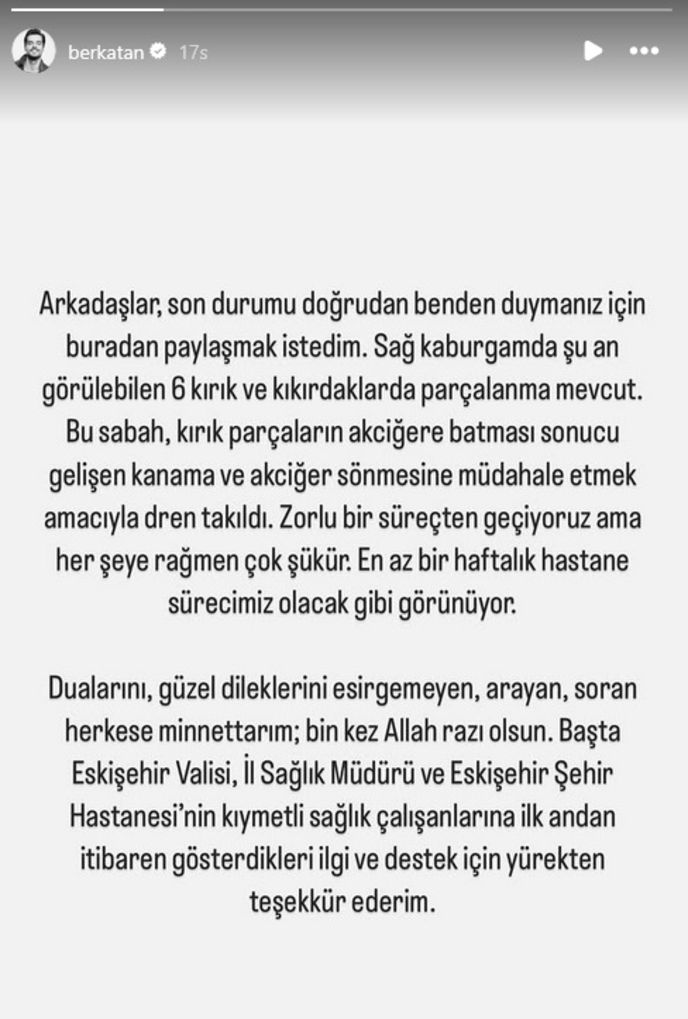 Berk Atan, sosyal medya hesabından şunları söyledi: Arkadaşlar, son durumu doğrudan benden duymanız için buradan paylaşmak istedim. Sağ kaburgamda şu an görülebilen 6 kırık ve kıkırdaklarda parçalanma mevcut. Bu sabah, kırık parçaların akciğere batması sonucu gelişen kanama ve akciğer sönmesine müdahale etmek amacıyla dren takıldı. Zorlu bir süreçten geçiyoruz ama her şeye rağmen çok şükür. En az bir haftalık hastane sürecimiz olacak gibi görünüyor. Dualarını, güzel dileklerini esirgemeyen, arayan, soran herkese minnettarım; bin kez Allah razı olsun. Başta Eskişehir Valisi, İl Sağlık Müdürü ve Eskişehir Şehir Hastanesi'nin kıymetli sağlık çalışanlarına ilk andan itibaren gösterdikleri ilgi ve destek için yürekten teşekkür ederim.