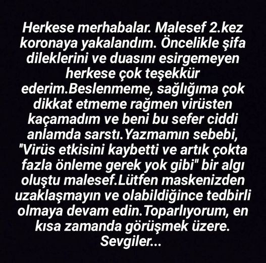 Ayrıca takipçilerini tedbirli olmaları konusunda uyaran 39 yaşındaki oyuncu, "Yazmamın sebebi, 'Vürs etkisini kaybetti ve artık çok da fazla önleme gerek yok' gibi bir algı oluştu maalesef. Lütfen maskenizden uzaklaşmayın ve olabildiğince tedbirli olmaya devam edin. Toparlıyorum, en kısa zamanda görüşmek üzere. Sevgiler..." ifadelerini kullandı.