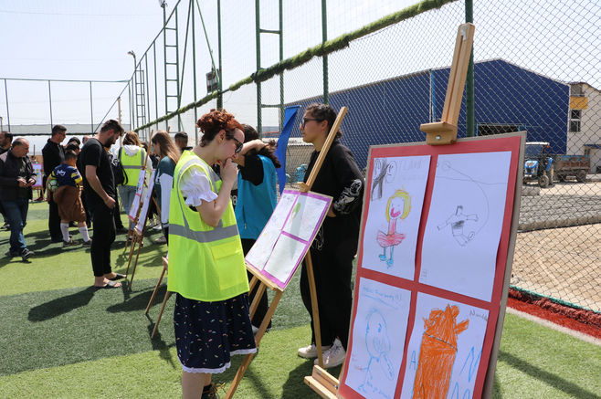 Çocukların resim ve karikatürlerinden oluşan serginin açılışının yapıldığı etkinlikte protokol üyeleri, sanatçılar ve çocuklar, futbol maçı yaptı.