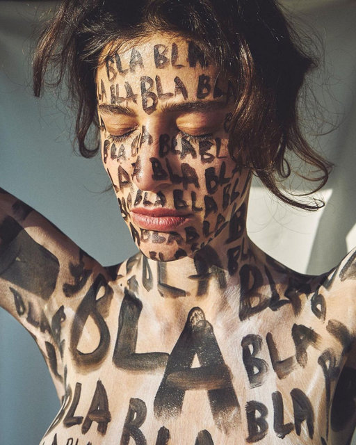 36 yaşındaki Tüzünataç'ın vücuduna yazılı olan, "Bla bla bla" kelimeleri dikkat çekti.