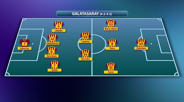 Teknik direktör Okan Buruk, takımına ileride Victor Osimhen, Yunus Akgün, Barış Alper Yılmaz, Leroy Sane ve Noa Lang gibi futbolcularla rakip kaleci ve savunma oyuncularına şiddetli baskı yaptırıyor. Orta alanda Gabriel Sara, Lucas Torreira ve Mario Lemina da ileride baskıya geride alan kapatarak destek veriyor.