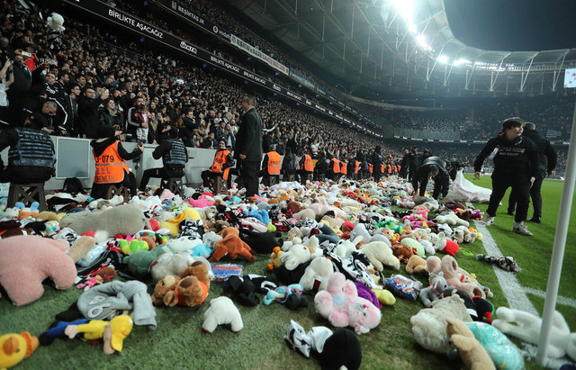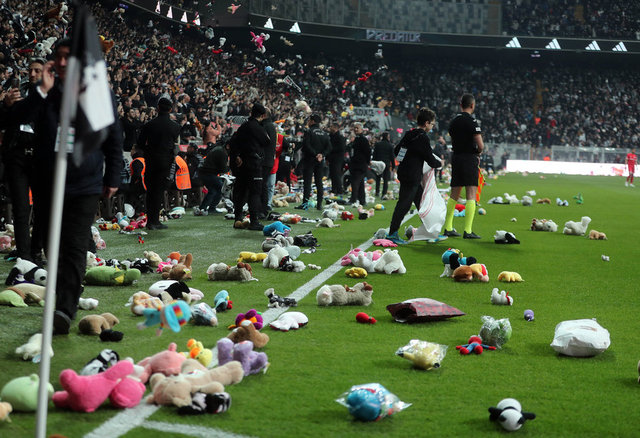 Reuters: Beşiktaş taraftarları, Pazar günü oynanan Antalyaspor maçında Türkiye ve Suriye'deki depremden etkilenen çocuklara bağışlamak için binlerce pelüş oyuncağı sahaya fırlattı.