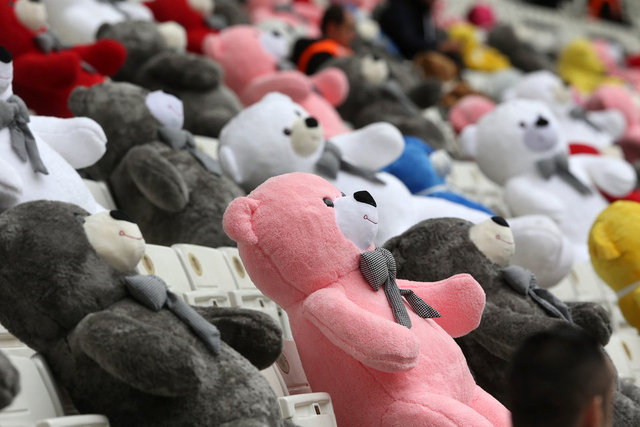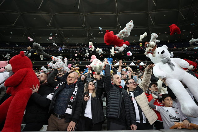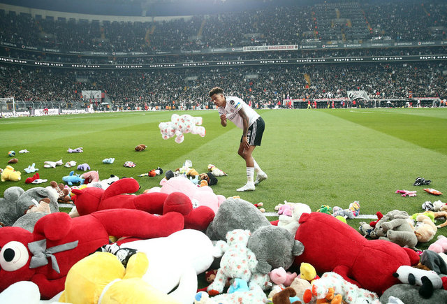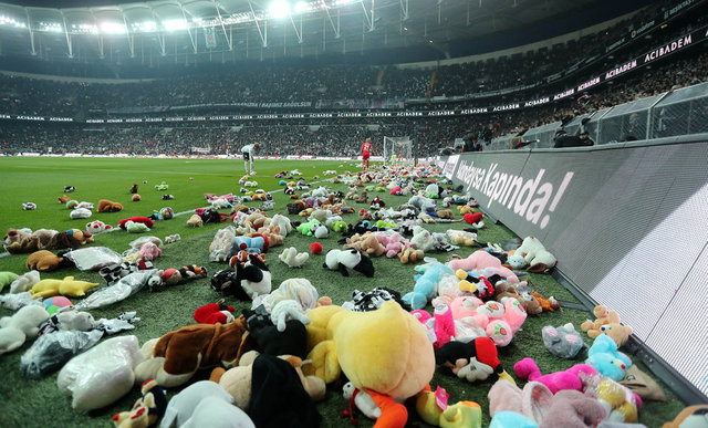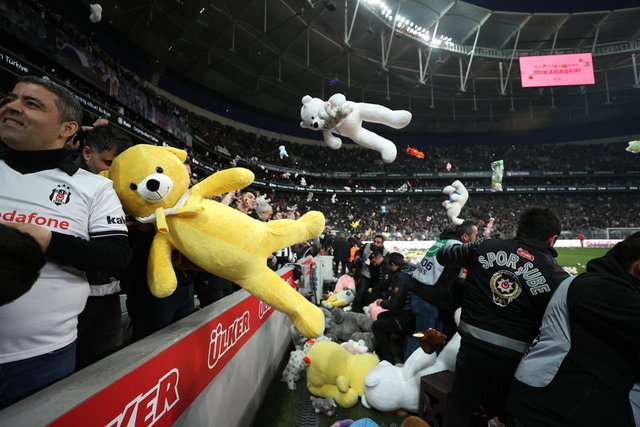 GOAL (İngiltere): Binlerce pelüş oyuncağı sahaya fırlattı: Pazar günü Süper Lig'de Antalyaspor ile oynanan karşılaşmada Beşiktaş taraftarları tribünlerden aldıkları hediyeleri sahaya fırlatırken, spor bir kez daha üzerine düşeni yapıyor.