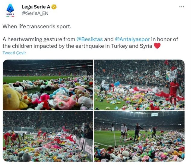 ABola (Portekiz): Gözyaşları içinde! Beşiktaş - Antalyaspor maçında futbol arka planda kaldı. Yıkıcı depremlerin ardından çok sayıda çocuğa yönelik taraftarların dayanışma jesti olarak binlerce oyuncak tribünlerden sahaya uçtu.