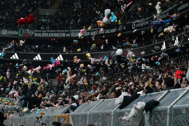 Beşiktaş'ın Vodafone Park'ta Fraport TAV Antalyaspor ile oynadığı Spor Toto Süper Lig maçında tribünlerden binlerce oyuncak sahaya atıldı.