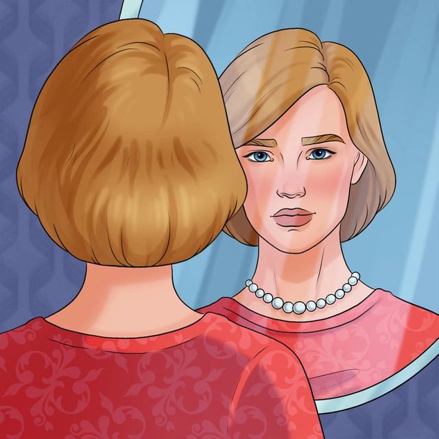 Cevap: Kadının aynadaki yansımasında inci kolye bulunuyor ancak kadının kendi boynunda kolye olmaması resmi hatalı yapıyor.