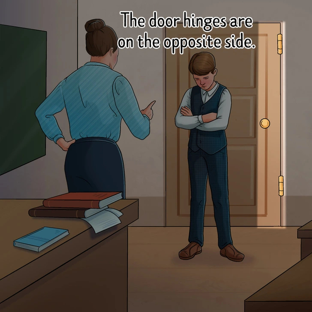 Cevap: Öğrencinin arkasında bulunan kapının tokmağıyla kapının bağlantı noktası olan menteşeleri aynı yerde duruyor, tam tersi yönlerde olmaları gerekiyor.