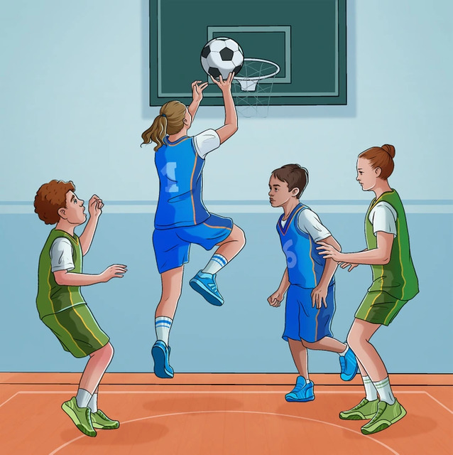 Cevap: Çocuklar basket topu yerine futbol topuyla basketbol oynamaya çalışıyor o yüzden bu hatalıdır.