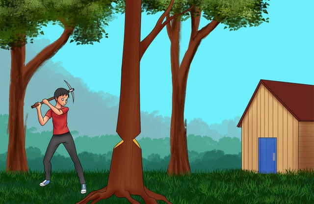 Cevap: Görseldeki kişi kazma ile ağacı kesmeye çalışıyor, bunun yerine elinde testere olmalıydı.