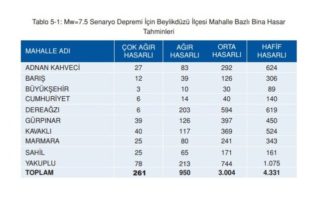 İBB raporuna göre; Mw=7.5 büyüklüğündeki senaryo depreminde, Beylikdüzü’ndeki binaların ortalama yüzde 33’ünün hasar görmeyeceği tahmin edilmektedir. Binaların ortalama yüzde 34’ünün hafif, yüzde 24’ünün orta, yüzde 7’sinin ağır ve yüzde 2’sinin de çok ağır hasar görmesi beklenmektedir. Beylikdüzü’nde, analiz edilen toplam bina sayısı 12.753’tür.