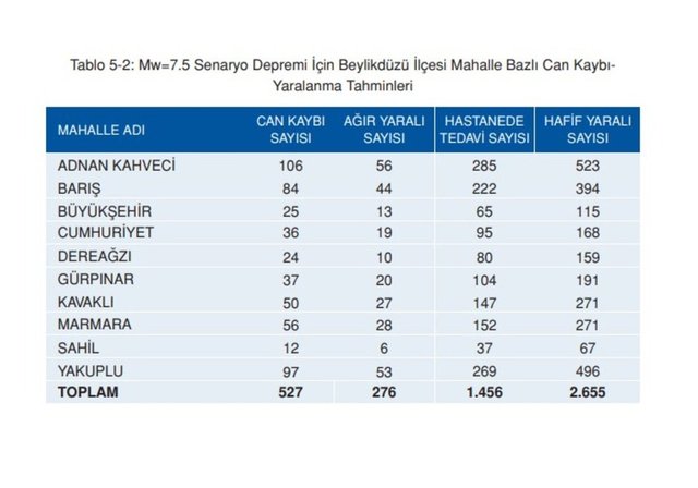 Mw=7.5 büyüklüğündeki senaryo depreminin, en kötü senaryo olan gece meydana gelmesi halinde, Beylikdüzü’nde ortalama 527 civarında can kaybı meydana gelebileceği, yaklaşık 276 kişinin ağır yaralanabileceği ve 1.456 kişinin de hastane şartlarında tedavi görmesi gerekebileceği öngörülmektedir.