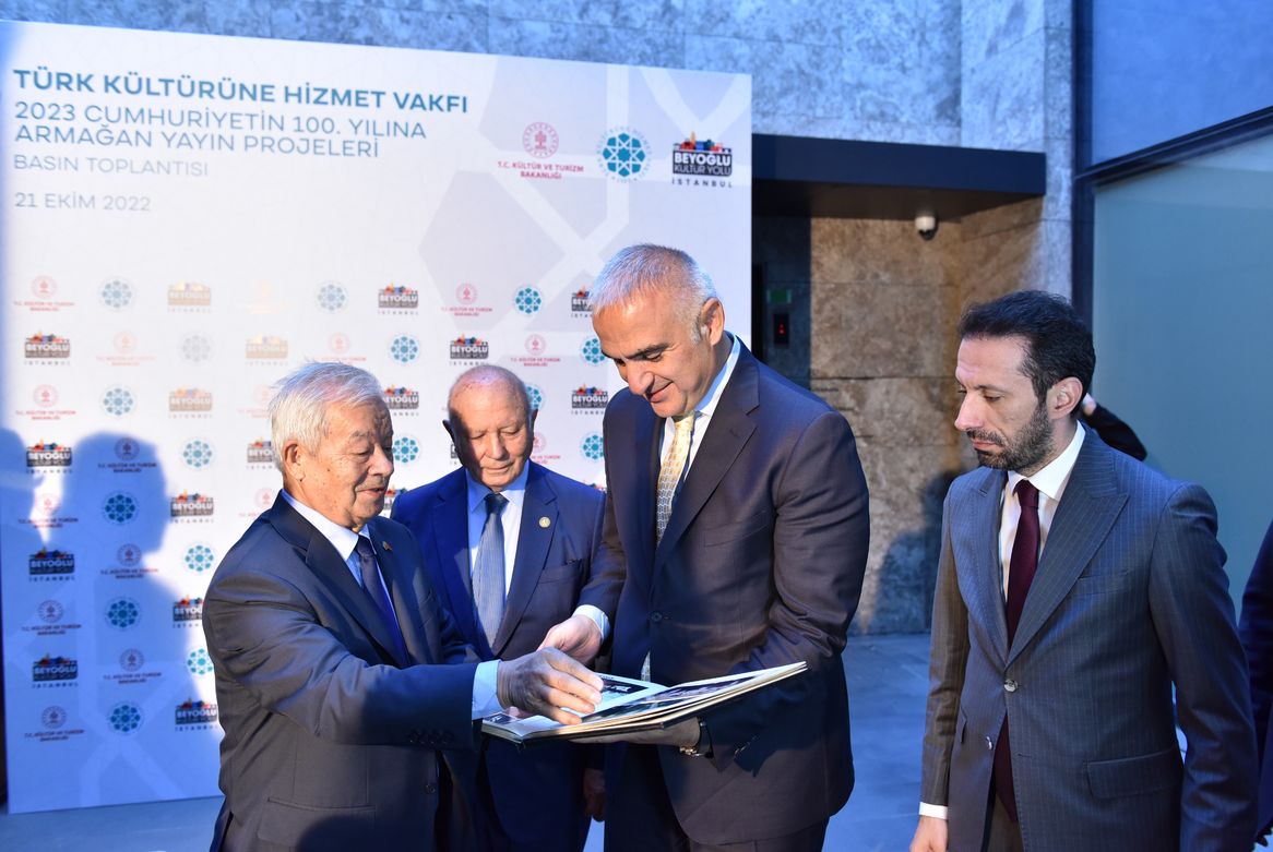 Toplantıda konuşan Kültür ve Turizm Bakanı Mehmet Nuri Ersoy, “Eserlerin hepimiz için önemli birer başucu kitapları olacağını düşünüyorum. Ama esas önemlisi, gelecek kuşaklara önemli birer başucu kitapları olarak aktarılmaları. Cumhuriyetimizin 100. yılını hem büyük coşku hem de büyük bir gururla kutlayacağımız 2023 yılında hayata geçirmek üzere farklı projelerimiz de olacak” dedi. Türk Kültürüne Hizmet Vakfı Yönetim Kurulu Başkanı Şerafettin Yılmaz da proje kapsamında 76 eser yayınlamayı planladıklarını belirtti. Tanıtımı yapılan eserler, 'Türk Devletleri Tarih ve Kültür Atlası', 'Türk Devletleri Tarih Atlası', "Cumhuriyet'in 100. Yılında 100 Türk Büyüğü",'Kültürümüzün Temelini Oluşturan Değerli İnsanlarımızın Biyografileri' ve 'Çağdaşı Yabancıların Gözünden Fatih Sultan Mehmed' çalışmalarından oluşuyor.