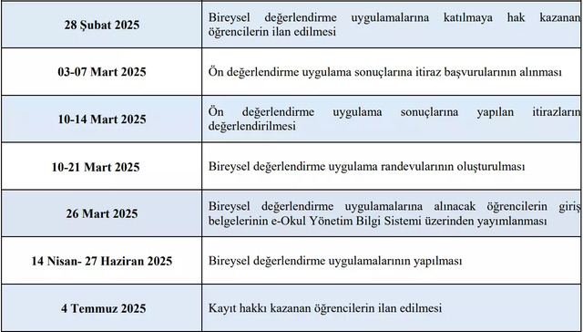 Bireysel değerlendirme uygulama randevuları 10-21 Mart 2025 tarihlerinde oluşturulacak. Giriş belgeleri 26 Mart 2025 tarihinde açıklanacak.