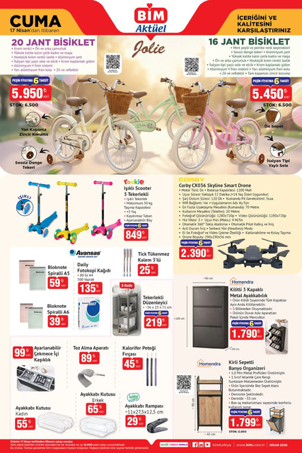 BİM marketin 14-17 Nisan aktüel kataloğu belli oldu. Yeni haftada BİM marketlerde televizyon, katlanabilir elektrikli bisiklet, kareoke mikrofon, mouse pad, kulaküstü kulaklık, cam ankastre set, kablolu dikey süpürge, buharlı el ütüsü, türk kahve makinesi, akıllı boyun masaj aleti, blender, şarjlı sensörlü çöp kovası, sakal kesme makinesi, oyuncak tavşan ailesi, 20 ve 16 jant bisiklet, smart drone, kilitli 3 kapaklı metal ayakkabılık, banyo organizeri, çift toka terlik, tek ve çift kişilik nevresim setleri gibi birçok ürün alışverişseverlerle buluşacak. İşte BİM 14-17 Nisan 2026 Salı ve Cuma aktüel broşürü haberimizde...