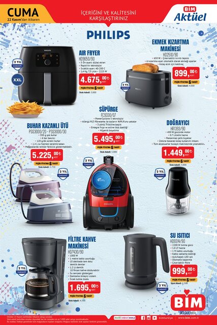 BİM 19-20-22 Kasım 2024 aktüel kataloğu yayınlandı. Böylece zincir marketin Salı, Çarşamba ve Cuma günleri satışa çıkaracağı indirimli ürünler belli oldu. Aktüel kataloğuna göre bu hafta farklı kategorilerden onlarca ürün raflarda alıcısını bekliyor olacak. Çekme karavan, espresso makinesi, beyaz eşya, halı koltuk temizleme makinesi, şarjlı süpürge, dikey ısıtıcı, air fryer, buhar kazanlı ütü en dikkat çeken ürünler arasında yer alıyor. İşte, BİM 6-8 Kasım 2024 aktüel kataloğu...
