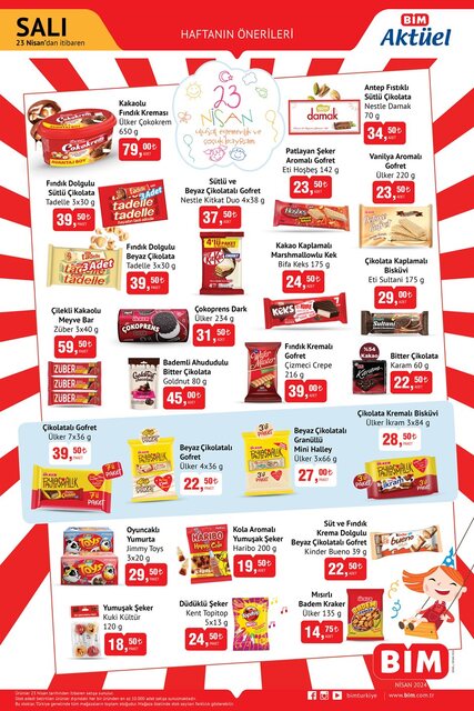 BİM 23 Nisan 2024 aktüel kataloğu internet sitesi üzerinden yayınlandı. Bu hafta BİM'de Ulusal Egemnlik ve Çocuk Bayramı'na özel atıştırmalık ürünler indirimli fiyatlarla raflardaki yerini alacak. Bu hafta Salı BİM kataloğunda; kişisel bakım ürünlerinden temizlik malzemelerine kadar birçok ürün indirimli fiyatıyla satışa sunulacak. İşte, BİM aktüel 23 Nisan 2024 kataloğu ile indirimli ürünler listesi...