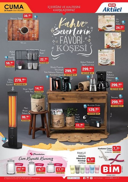 BİM 26 Kasım 2021 aktüel ürünleri bugün satışa çıkıyor. BİM'de bu cuma; Kahve Severlerin favori Köşesi, Türk Kahve Makinesi, Fakir Kahve ve Baharat Öğütücü, Polosmart RGB Gaming Klavye, Teleskop ve gıda ürünlerinde birçok indirimli fiyat yer alıyor. İşte, BİM kataloğu...