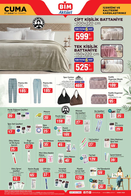 BİM marketlerinde bu Cuma hangi ürünlerin satışta olacağı belli oldu. BİM 27 Şubat aktüel kataloğunda yer alan teknolojik aletlerden ev eşyalarına, mutfak gereçlerinden çocuk oyuncaklarına, kişisel bakım ürünlerinden ısıtıcılara kadar birçok ürün raflarda yerini alacak. İşte BİM 27 Şubat Cuma aktüel broşürü...