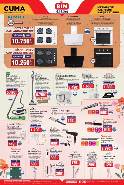 BİM 3-6 Mart aktüel kataloğu yayınlandı. Mart ayının ilk haftasında BİM marketlerde dana-kuzu kıyma, piliç pirzola, içli köfte, buğday unu, televizyon, ankastre set, çalışma koltuğu, halı ve koltuk yıkama makinesi, blender, buharlı ütü, epilasyon aleti, saç şekillendirici, kaş düzeltici, fırın kabı, kızartma tenceresi, ekmeklikli mutfak dolabı, valiz organizer seti, puzzle gibi birçok ürün alışverişseverlerle buluşacak. İşte BİM 3-6 Mart 2026 Salı ve Cuma aktüel broşürü haberimizde...