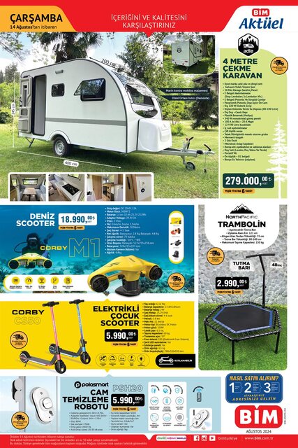 BİM 14-16 Ağustos aktüel kataloğu yayınlandı. Bu hafta zincir marketlere karavan, tiny house başta olmak üzere; buzdolabı, televizyon, elektrikli süpürge, çamaşırlık, ütü masası gibi yüzlerce ürün satışa çıkıyor. İşte, 14-16 Ağustos BİM güncel aktüel kataloğu...
