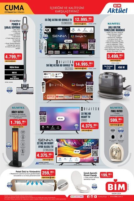 BİM, her hafta olduğu gibi 22 Kasım'da da dikkat çeken aktüel ürünleriyle tüketicilerin karşısına çıkacak. Cuma günleri satışa sunulacak ürünlerde dikey ısıtıcı, televizyon, buhar kazanlı ütü yer aldı. İşte 22 Kasım 2024 BİM aktüel ürünler kataloğu tamamı