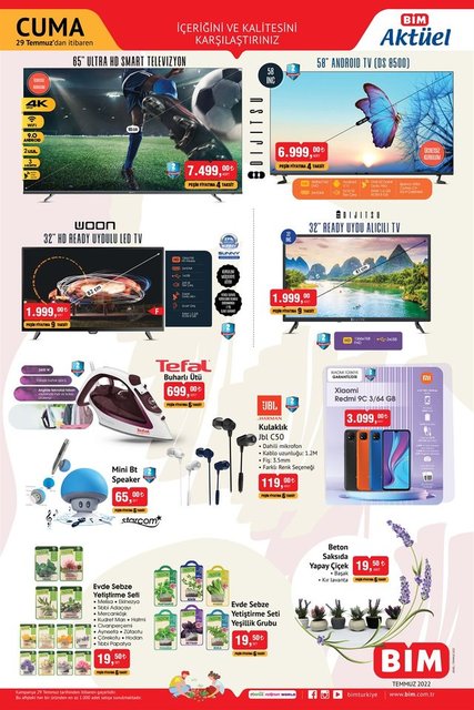 BİM aktüel ürünler katoloğu yayınlandı. Bilindiği gibi salı ve cuma günleri olmak üzere haftada iki kez yayınlanan indirimli ürünler listesi alışverişseverler tarafından yakından takip ediliyor. Bu hafta masa örtüsünden, tabak setine, tepsilerden, mutfak halısına, yazlık terlikten spor ayakkabısına, Türk kahve makinesinden, meşrubat bardağına, smart TV'lerden, akıllı telefonlara daha birçok ürün raflardaki yerini alacak. İşte 29 Temmuz 2022 : BİM indirimli ürünler listesi...