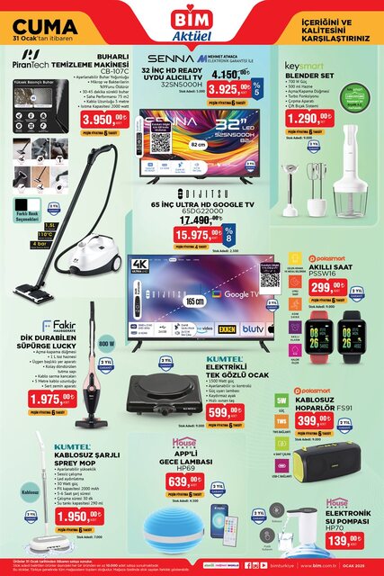 BİM 31 Ocak 2025 aktüel kataloğu ile Cuma günü indirime giren ev eşyaları, kişisel bakım ürünleri ve daha fazlasını keşfedin. elektrikli bisiklet, buharlı temizleme makinesi, akıllı saat gibi popüler ürünler uygun fiyatlarla satışta. İşte BİM aktüel ürünler kataloğu tamamı