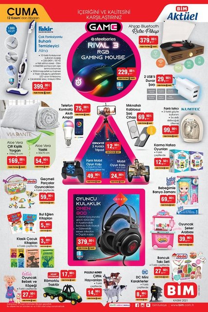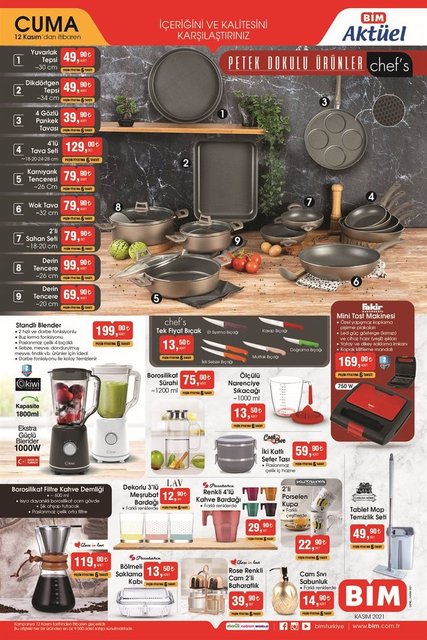12 Kasım Cuma günü BİM marketlerde satışa çıkan fırsat ürünleri araştırılıyor. 12 Kasım 2021 BİM Aktüel ürünler kataloğuna göre BİM'de bugün mıknatıslı kablosuz şarj aletinden buharlı temizleyiciye, ikili sefer tasından dörtlü pankek tavasına, kahve demliğinden banyo paspasına kadar pek çok ürün indirimli fiyatlarıyla raflardaki yerini aldı. İşte BİM fırsat ürünleri 12 Kasım Cuma