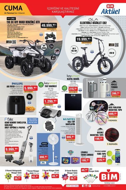 BİM'e ATV ve elektrikli bisiklet geliyor! BİM aktüel kataloğu ile fiyat listesi alışveriş takipçilerinin gündeminde yer alıyor. BİM aktüel ürünler listesinde bu hafta temmuz ayına özel ürünler raflarda yerini alarak alıcılarıyla buluşmaya hazırlanıyor. Haftanın fırsatlarını alışveriş takipçileri için haberimizde derledik. İşte BİM aktüel 26 Temmuz 2024 kataloğu ile temmuz ayına özel indirimli ürünlerin fiyatları...