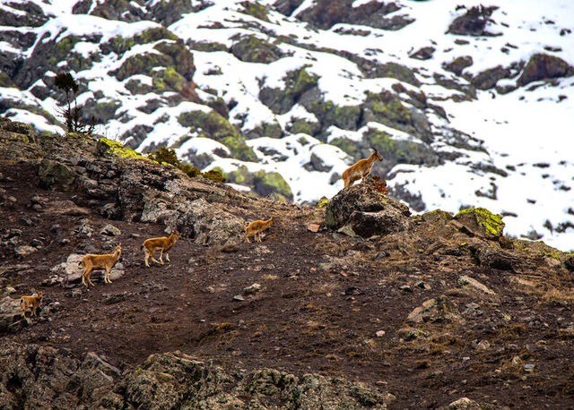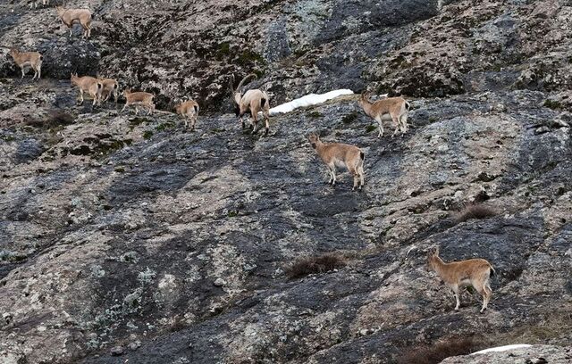 Yaban keçilerinin sürü halinde kayalıklarda ve yer yer karlı dağlardaki gezintisi görüntülendi.
